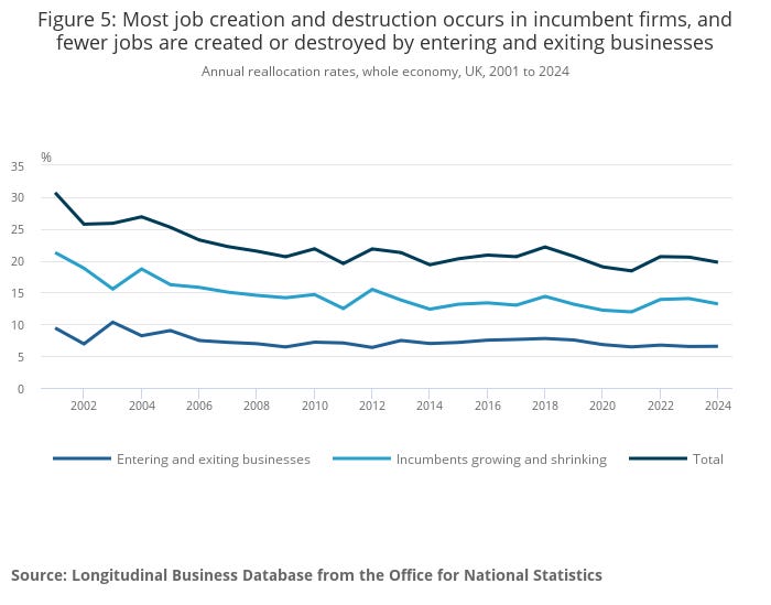 The cost of that, though, is stagnation. Earlier this week, the ONS released its latest figures tracing business dynamism in the UK.